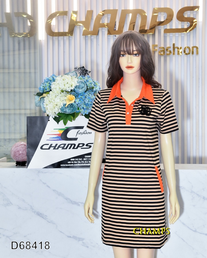 ĐẦM THUN KẺ NÂU CỔ CAM 68418